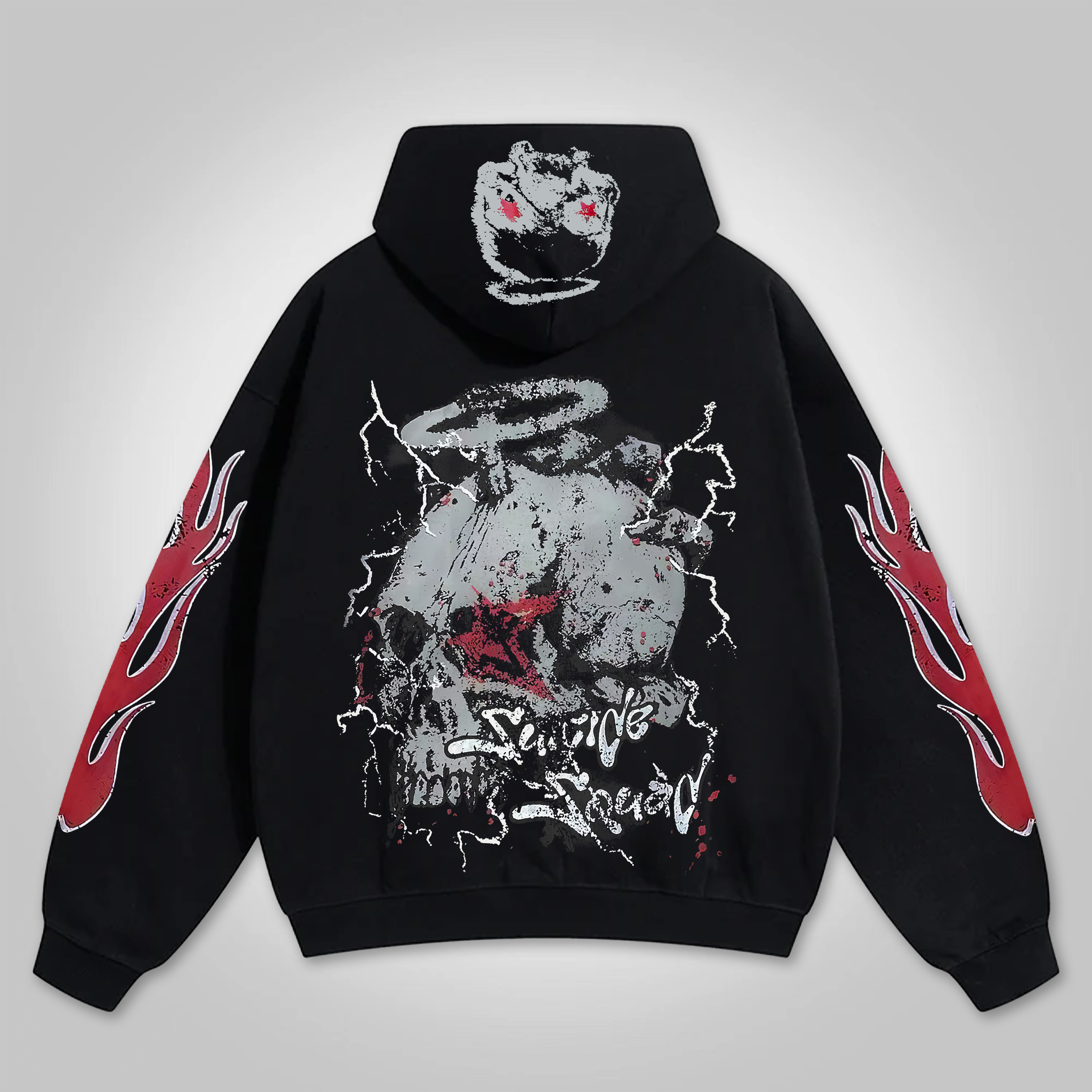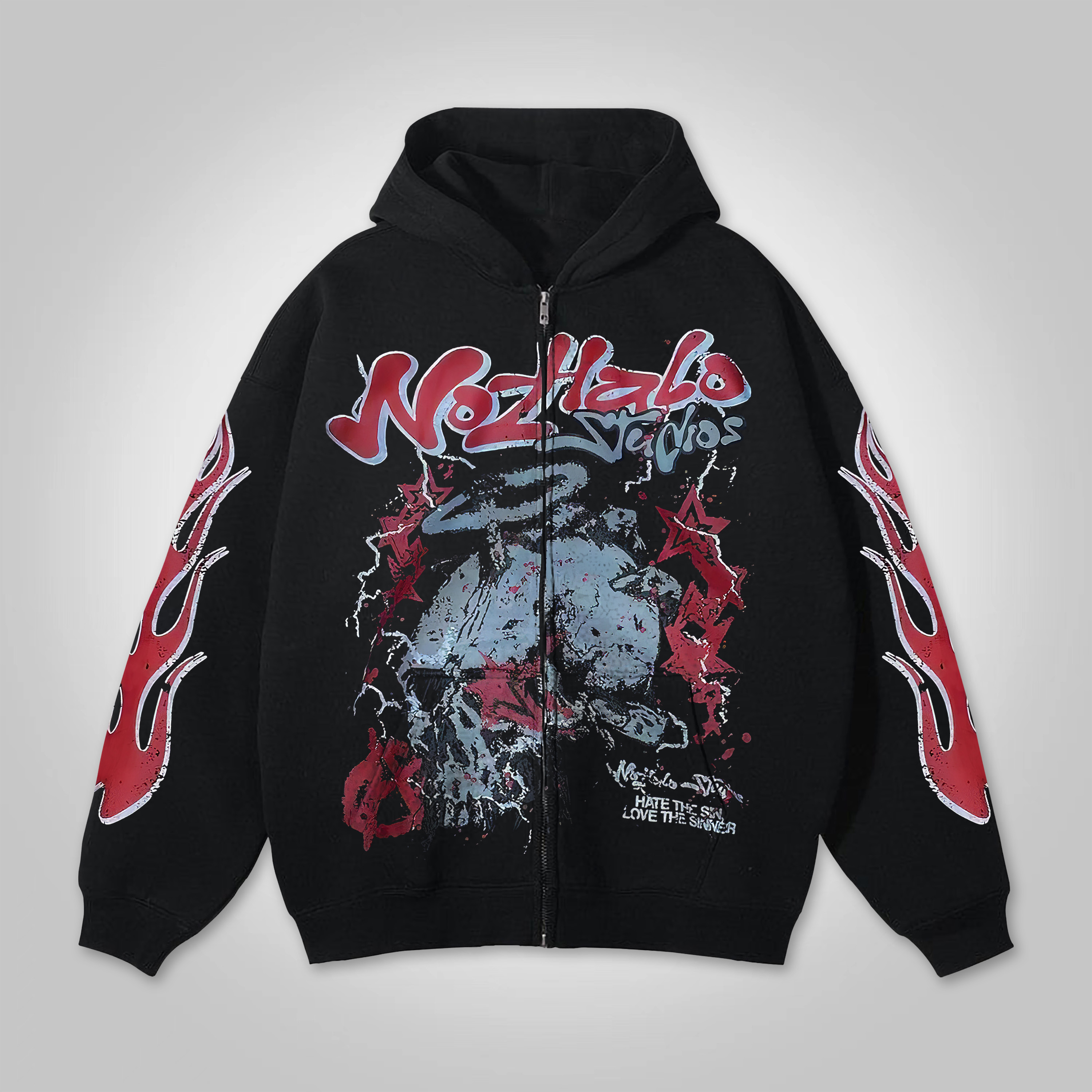 Retro Hellfire Death Skull Graphic Print Zip-Up Hoodie